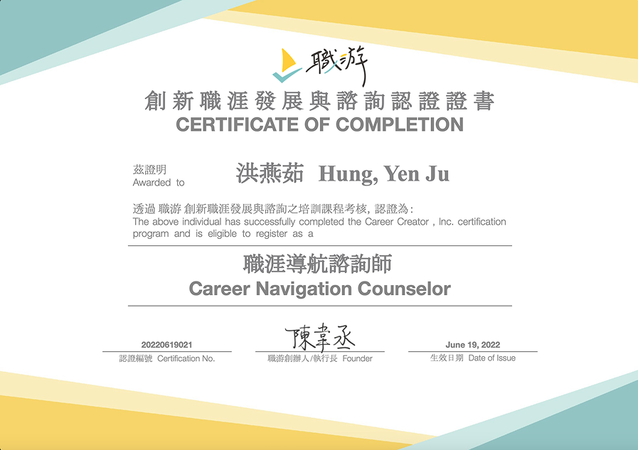 花了十年,一路探索自己,從視覺傳達設計系、國中美術老師、廣告業特助、企業管理研究所、芬蘭學設計、設計顧問業經理,再到自由工作的講師、職涯諮詢師、共同創辦「職游」,終於找到熱愛的飛行方向「生涯諮詢 x 設計思考 x 教育創新」。